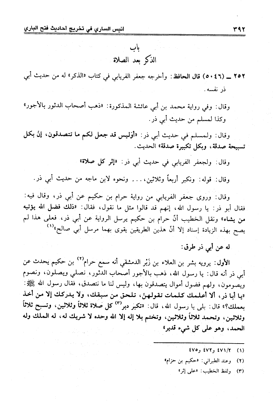 وقال: وروى جعفر الفريابي من رواية حرام بن حكيم عن أبي ذر، وقال فيه: فقال أبو ذر: يا رسول الله، إنهم قد قالوا مثل ما نقول، فقال: "ذلك فضل الله يؤتيه من يشاء" ونقل الخطيب أنّ حرام بن حكيم يرسل الرواية عن أبي ذر، فعلى هذا لم يصح بهذه الزيادة إسناد إلا أن هذين الطريقين يقوى بهما مرسل أبي صالح" (¬1)