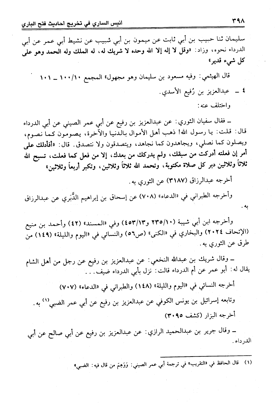 - فقال سفيان الثوري: عن عبد العزيز بن رفيع عن أبي عمر الصيني عن أبي الدرداء قال: قلت: يا رسول الله! ذهب أهل الأموال بالدنيا والآخرة، يصومون كما نصوم، ويصلون كما نصلي، ويجاهدون كما نجاهد، ويتصدقون ولا نتصدق. قال: "أفأدلك على أمر إن فعلته أدركت من سبقك، ولم يدركك من بعدك، إلا من فعل كما فعلت، تسبح الله ثلاثاً وثلاثين دبر كل صلاة مكتوبة، وتحمد الله ثلاثاً وثلاثين، وتكبر أربعاً وثلاثين".