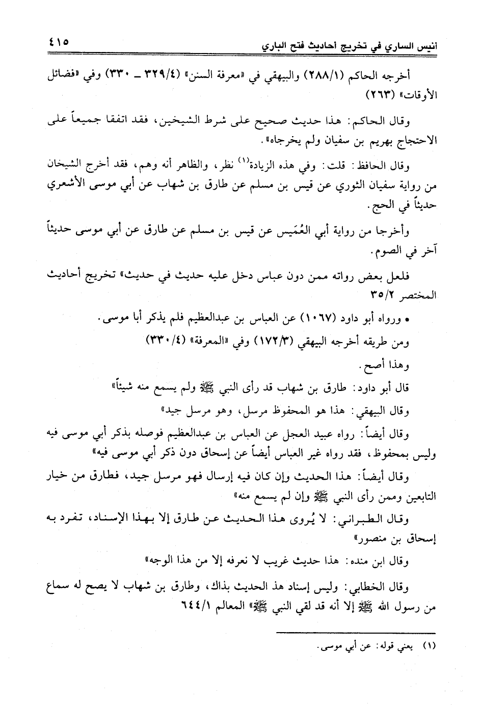 وقال الحافظ: قلت: وفي هذه الزيادة (¬1) نظر، والظاهر أنه وهم، فقد أخرج الشيخان من رواية سفيان الثوري عن قيس بن مسلم عن طارق بن شهاب عن أبي موسى الأشعري حديثاً في الحج.