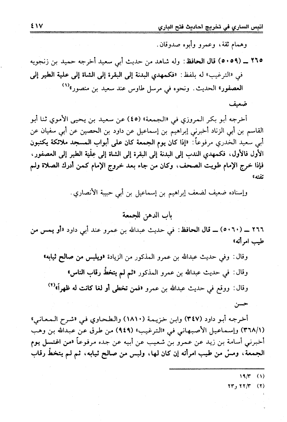 265 - (5059) قال الحافظ: وله شاهد من حديث أبي سعيد أخرجه حميد بن زنجويه في "الترغيب" له بلفظ: "فكمهدي البدنة إلى البقرة إلى الشاة إلى علية الطير إلى العصفور" الحديث. ونحوه في مرسل طاوس عند سعيد بن منصور" (¬1)