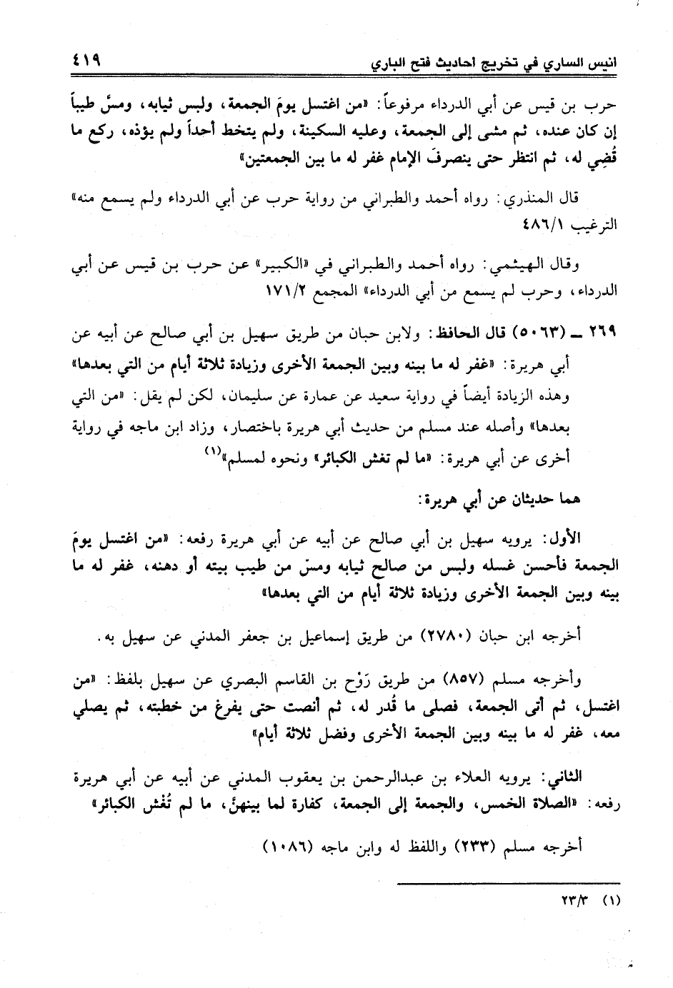 269 - (5063) قال الحافظ: ولابن حبان من طريق سهيل بن أبي صالح عن أبيه عن أبي هريرة: "غفر له ما بينه وبين الجمعة الأخرى وزيادة ثلاثة أيام من التي بعدها" وهذه الزيادة أيضاً في رواية سعيد عن عمارة عن سليمان، لكن لم يقل: "من التي بعدها" وأصله عند مسلم من حديث أبي هريرة باختصار، وزاد ابن ماجه في رواية أخرى عن أبي هريرة: "ما لم تغش الكبائر" ونحوه لمسلم" (¬1)