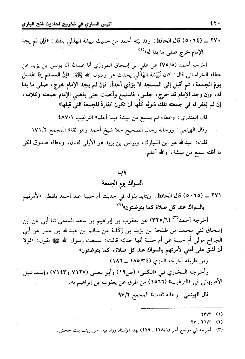 271 - (5065) قال الحافظ: ويتأيد بقوله في حديث أم حبيبة عند أحمد بلفظ: "لأمرتهم بالسواك عند كل صلاة كما يتوضئون" (¬2)