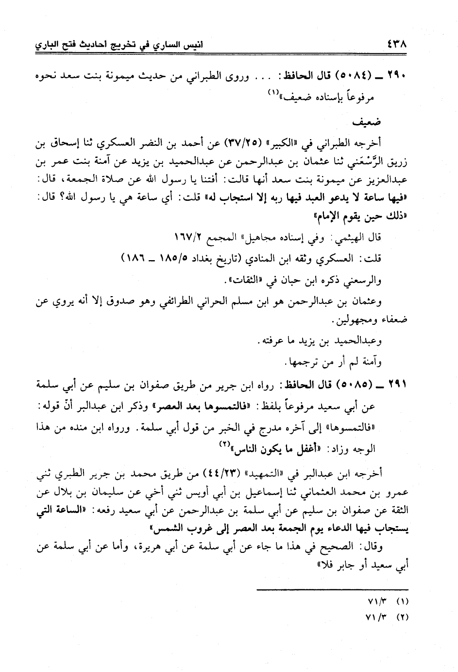291 - (5085) قال الحافظ: رواه ابن جرير من طريق صفوان بن سليم عن أبي سلمة عن أبي سعيد مرفوعاً بلفظ: "فالتمسوها بعد العصر" وذكر ابن عبد البر أنّ قوله: "فالتمسوها" إلى آخره مدرج في الخبر من قول أبي سلمة. ورواه ابن منده من هذا الوجه وزاد: "أغفل ما يكون الناس" (¬2)