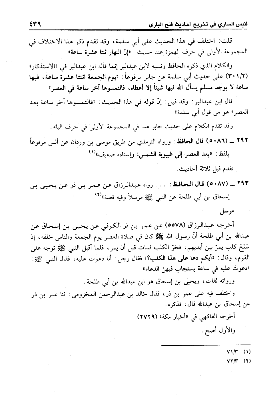 والكلام الذي ذكره الحافظ ونسبه لابن عبد البر إنما قاله ابن عبد البر في "الاستذكار" (2/ 301) على حديث أبي سلمة عن جابر مرفوعاً: "يوم الجمعة اثنتا عشرة ساعة، فيها ساعة لا يوجد مسلم يسأل الله فيها شيئًا إلا أعطاه، فالتمسوها آخر ساعة في العصر"