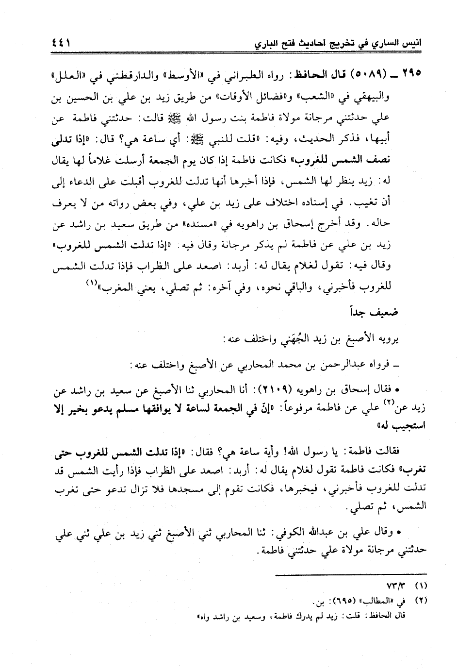 295 - (5089) قال الحافظ: رواه الطبراني في "الأوسط" والدارقطني في "العلل" والبيهقي في "الشعب" و"فضائل الأوقات" من طريق زيد بن علي بن الحسين بن علي حدثتني مرجانة مولاة فاطمة بنت رسول الله -صلى الله عليه وسلم- قالت: حدثتني فاطمة عن أبيها، فذكر الحديث، وفيه: "قلت للنبي -صلى الله عليه وسلم-: أي ساعة هي؟ قال: "إذا تدلى نصف الشمس للغروب" فكانت فاطمة إذا كان يوم الجمعة أرسلت غلامًا لها يقال له: زيد ينظر لها الشمس، فإذا أخبرها أنها تدلت للغروب أقبلت على الدعاء إلى أن تغيب. في إسناده اختلاف على زيد بن علي، وفي بعض رواته من لا يعرف حاله. وقد أخرج إسحاق بن راهويه في "مسنده" من طريق سعيد بن راشد عن زيد بن علي عن فاطمة لم يذكر مرجانة وقال فيه: "إذا تدلت الشمس للغروب" وقال فيه: تقول لغلام يقال له: أربد: اصعد على الظراب فإذا تدلت الشمس للغروب فأخبرني، والباقي نحوه، وفي آخره: ثم تصلي، يعني المغرب" (¬1)