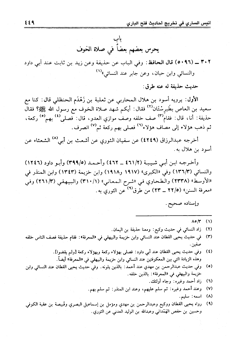 302 - (5096) قال الحافظ: وفي الباب عن حذيفة وعن زيد بن ثابت عند أبي داود والنسائي وابن حبان، وعن جابر عند النسائي" (¬1)