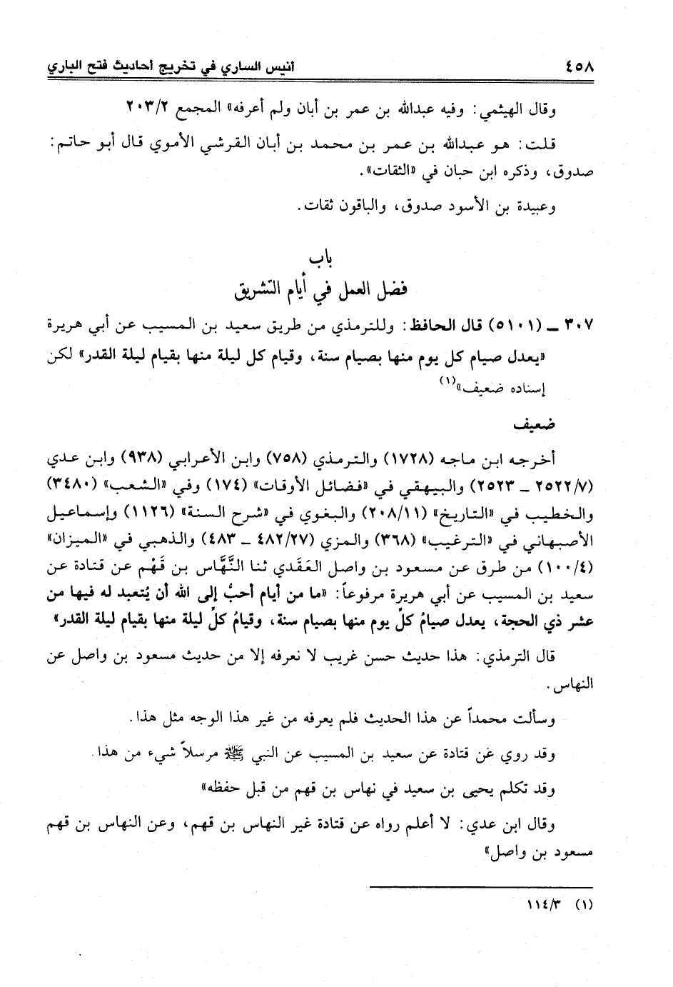 307 - (5101) قال الحافظ: وللترمذي من طريق سعيد بن المسيب عن أبي هريرة "يعدل صيام كل يوم منها بصيام سنة، وقيام كل ليلة منها بقيام ليلة القدر" لكن إسناده ضعيف" (¬1)