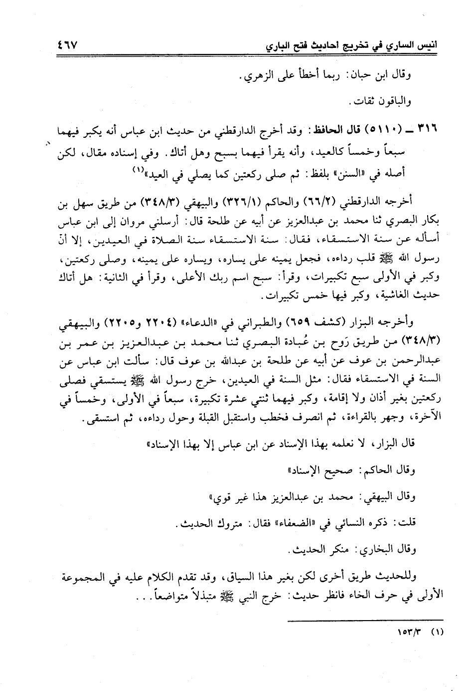 316 - (5110) قال الحافظ: وقد أخرج الدارقطني من حديث ابن عباس أنه يكبر فيهما سبعًا وخمسًا كالعيد، وأنه يقرأ فيهما بسبح وهل أتاك. وفي إسناده مقال، لكن أصله في "السنن" بلفظ: ثم صلى ركعتين كما يصلي في العيد" (¬1)