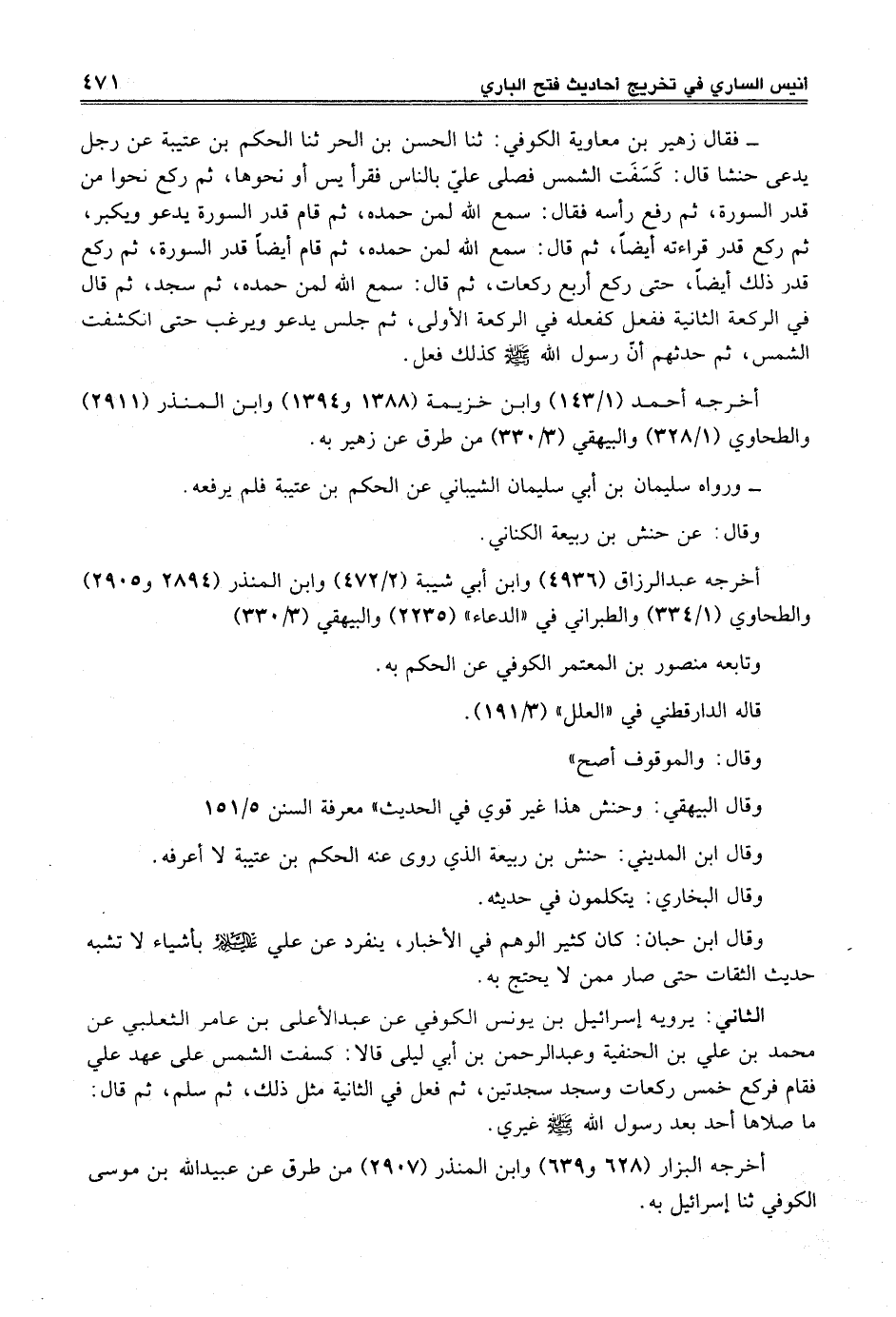 - فقال زهير بن معاوية الكوفي: ثنا الحسن بن الحر ثنا الحكم بن عتيبة عن رجل يدعى حنشا قال: كَسَفَت الشمس فصلى عليّ بالناس فقرأ يس أو نحوها، ثم ركع نحوا من قدر السورة، ثم رفع رأسه فقال: سمع الله لمن حمده، ثم قام قدر السورة يدعو ويكبر، ثم ركع قدر قراءته أيضاً، ثم قال: سمع الله لمن حمده، ثم قام أيضاً قدر السورة، ثم ركع قدر ذلك أيضاً، حتى ركع أربع ركعات، ثم قال: سمع الله لمن حمده، ثم سجد، ثم قال في الركعة الثانية ففعل كفعله في الركعة الأولى، ثم جلس يدعو ويرغب حتى انكشفت الشمس، ثم حدثهم أنّ رسول الله -صلى الله عليه وسلم- كذلك فعل.