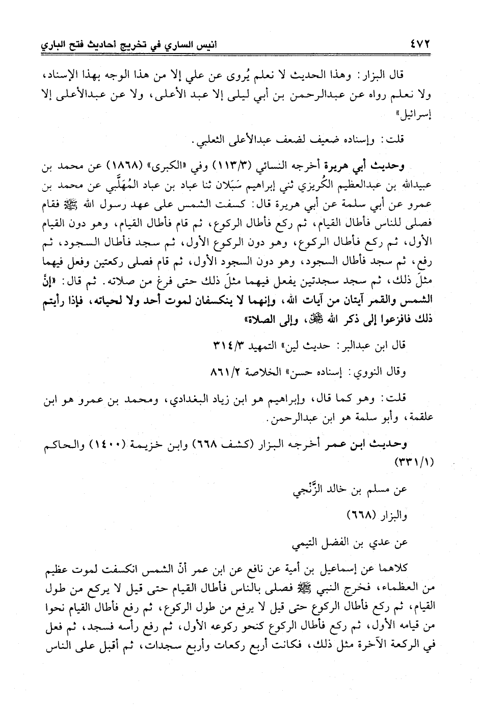 وحديث أبى هريرة أخرجه النسائي (3/ 113) وفي "الكبرى" (1868) عن محمد بن عبيد الله بن عبد العظيم الكُريزي ثني إبراهيم سَبَلان ثنا عباد بن عباد المُهَلَّبي عن محمد بن عمرو عن أبي سلمة عن أبي هريرة قال: كسفت الشمس على عهد رسول الله -صلى الله عليه وسلم- فقام فصلى للناس فأطال القيام، ثم ركع فأطال الركوع، ثم قام فأطال القيام، وهو دون القيام الأول، ثم ركع فأطال الركوع، وهو دون الركوع الأول، ثم سجد فأطال السجود، ثم رفع، ثم سجد فأطال السجود، وهو دون السجود الأول، ثم قام فصلى ركعتن وفعل فيهما مثلَ ذلك، ثم سجد سجدتين يفعل فيهما مثلَ ذلك حتى فرغ من صلاته. ثم قال: "إنَّ الشمس والقمر آيتان من آيات الله، وإنهما لا ينكسفان لموت أحد ولا لحياته، فإذا رأيتم ذلك فافزعوا إلى ذكر الله عز وجل، وإلى الصلاة"