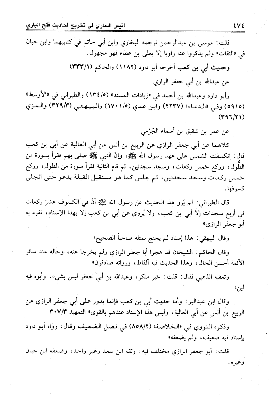 قال الطبراني: لم يَرو هذا الحديث عن رسول الله -صلى الله عليه وسلم- أنّ في الكسوف عشرَ ركعات في أربع سجدات إلا أبي بن كعب، ولا يُروى عن أبي بن كعب إلا بهذا الإسناد، تفرد به أبو جعفر الرازي"