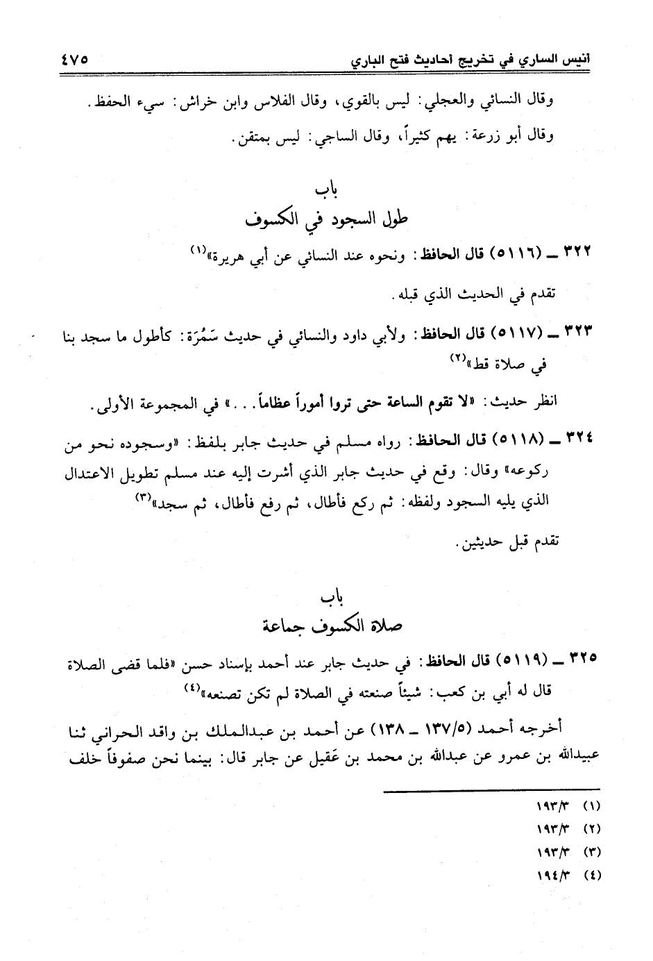 324 - (5118) قال الحافظ: رواه مسلم في حديث جابر بلفظ: "وسجوده نحو من ركوعه" وقال: وقع في حديث جابر الذي أشرت إليه عند مسلم تطويل الاعتدال الذي يليه السجود ولفظه: ثم ركع فأطال، ثم رفع فأطال، ثم سجد" (¬3)