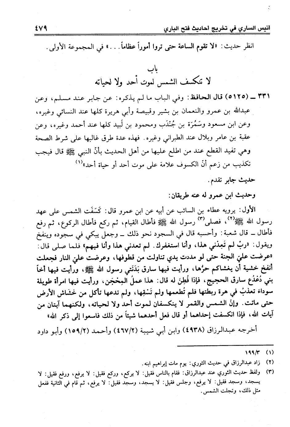 331 - (5125) قال الحافظ: وفي الباب ما لم يذكره: عن جابر عند مسلم، وعن عبد الله بن عمرو والنعمان بن بشير وقبيصة وأبي هريرة كلها عند النسائي وغيره، وعن ابن مسعود وسَمُرَة بن جُنْدَب ومحمود بن لَبيد كلها عند أحمد وغيره، وعن عقبة بن عامر وبلال عند الطبراني وغيره. فهذه عدة طرق غالبها على شرط الصحة وهي تفيد القطع عند من اطلع عليها من أهل الحديث بأنّ النبي -صلى الله عليه وسلم- قال فيجب تكذيب من زعم أنّ الكسوف علامة على موت أحد أو حياة أحد" (¬1)