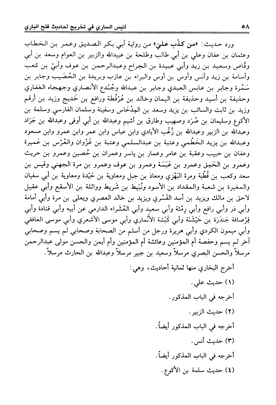 ورد حديث: "من كذّب عليّ" من رواية أبي بكر الصديق وعمر بن الخطاب وعثمان بن عفان وعلي بن أبي طالب وطلحة بن عبيد الله والزبير بن العوام وسعد بن أبي وقاص وسعيد بن زيد وأبي عبيدة بن الجراح وعبد الرحمن بن عوف وأبىّ بن كعب وأسامة بن زيد وأنس وأوس بن أوس والبراء بن عازب وبريدة بن الحُصَيب وجابر بن سَمُرة وجابر بن عابس العبدي وجابر بن عبد الله وجُنْدع الأنصاري وجهجاه الغفاري وحذيفة بن أسيد وحذيفة بن اليمان وخالد بن عُرْفُطة ورافع بن خَديج وزيد بن أرقم وزيد بن ثابت والسائب بن يزيد وسعد بن المِدْحَاس وسفينة وسلمان الفارسي وسلمة بن الاْكوع وسليمان بن صُرَد وصهيب وطارق بن أشيم وعبد الله بن أبي أوفى وعبد الله بن جَرَاد وعبد الله بن الزبير وعبد الله بن زُغْب الأيادي وابن عباس وابن عمر وابن عمرو وابن مسعود وعبد الله بن يزيد الخَطْمي وعتبة بن عبد السلمي وعتبة بن غَزْوان والعُرْس بن عَميرة وعفان بن حبيب وعقبة بن عامر وعمار بن ياسر وعمران بن حُصين وعمرو بن حريث وعمرو بن الحَمِق وعمرو بن عَبَسَة وعمرو بن عوف وعمرو بن مرة الجهني وقيس بن سعد وكعب بن قُطْبة ومرة البَهْزي ومعاذ بن جبل ومعاوية بن حَيْدة ومعاوية بن أبي سفيان والمغيرة بن شعبة والمقداد بن الأسود ونُبَيط بن شَريط وواثلة بن الأسقع وأبي عقيل لاحق بن مالك ويزيد بن أسد القَسْري ويزيد بن خالد العصري ويعلي بن مرة وأبي أمامة وأبي ذر وأبي رافع وأبي رِمْثة وأبي سعيد وأبي العُشَراء الدارمي عن أبيه وأبي قتادة وأبي قِرْصافة جَندَرَة بن خَيْشَنَة وأبي كَبْثة الأَنْماري وأبي موسى الأشعري وأبي موسى الغافقي وأبي ميمون الكردي وأبي هريرة ورجل من أسلم من الصحابة وصحابي لم يسم وصحابي آخر لم يسم وحفصة أم المؤمنين وعائشة أم المؤمنين وأم أيمن والحسن مولى عبد الرحمن مرسلاً والحسن البصري مرسلا وسعيد بن جبير مرسلاً وعبد الله بن الحارث مرسلاً.