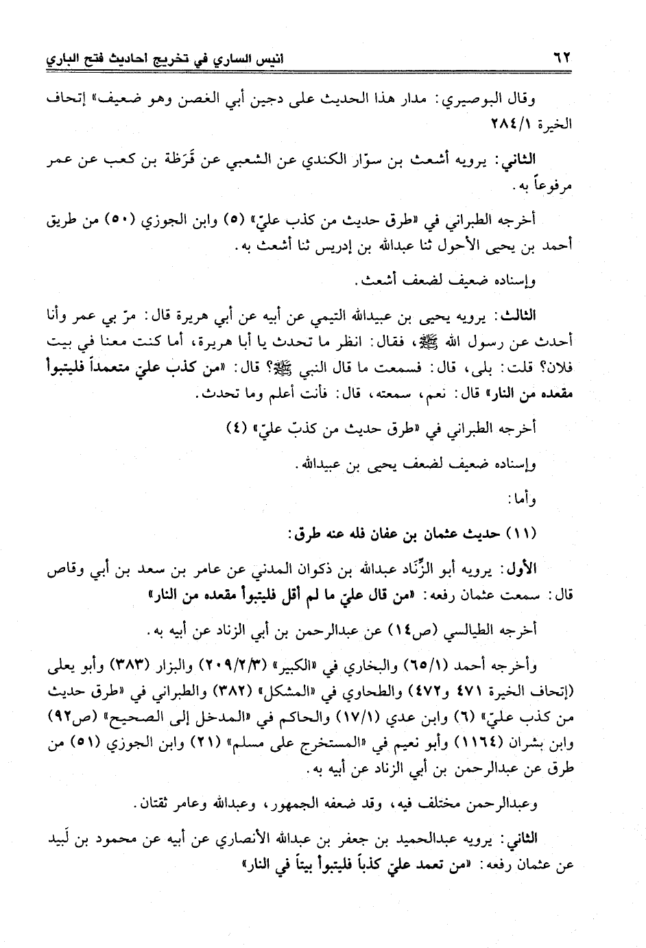 الأول: يرويه أبو الزِّنَاد عبد الله بن ذكوان المدني عن عامر بن سعد بن أبي وقاص قال: سمعت عثمان رفعه: "من قال عليّ ما لم أقل فليتبوأ مقعده من النار"