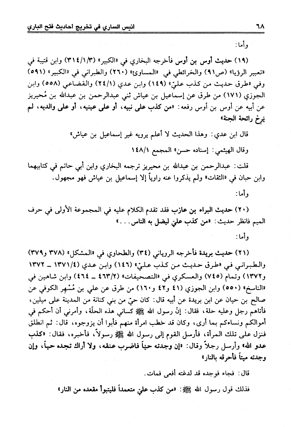 (21) حديث بريد ة فأخرجه الروياني (34) والطحاوي في "المشكل" (378 و379) والطبراني في "طرق حديث من كذب عليّ" (146) وابن عدي (4/ 1371 - 1372 و1372) وتمام (745) والعسكري في "التصحيفات" (2/ 463 - 464) وابن شاهين في "الناسخ" (550) وابن الجوزي (41 و42 و160) من طرق عن علي بن مُسْهِر الكوفي عن صالح بن حيان عق ابن بريدة عن أبيه قال: كان حيّ من بني كنانة من المدينة على ميلين، فأتاهم رجل وعليه حلة، فقال: إنّ رسول الله -صلى الله عليه وسلم- كساني هذه الحلّة، وأمرني أن أحكم في أموالكم ونساءكم بما أرى، وكان قد خطب امرأة منهم فأبوا أن يزوجوه، قال: ثم انطلق فنزل على تلك المرأة، فأرسل القوم إلى رسول الله -صلى الله عليه وسلم- رسولاً، فأخبره، فقال: "كذب عدو الله" وأرسل رجلاً وقال: "إن وجدته حيّاً فاضرب عنقه؟ ولا أراك تجده حياً، وإن وجدته ميتاً فأحرقه بالنار"