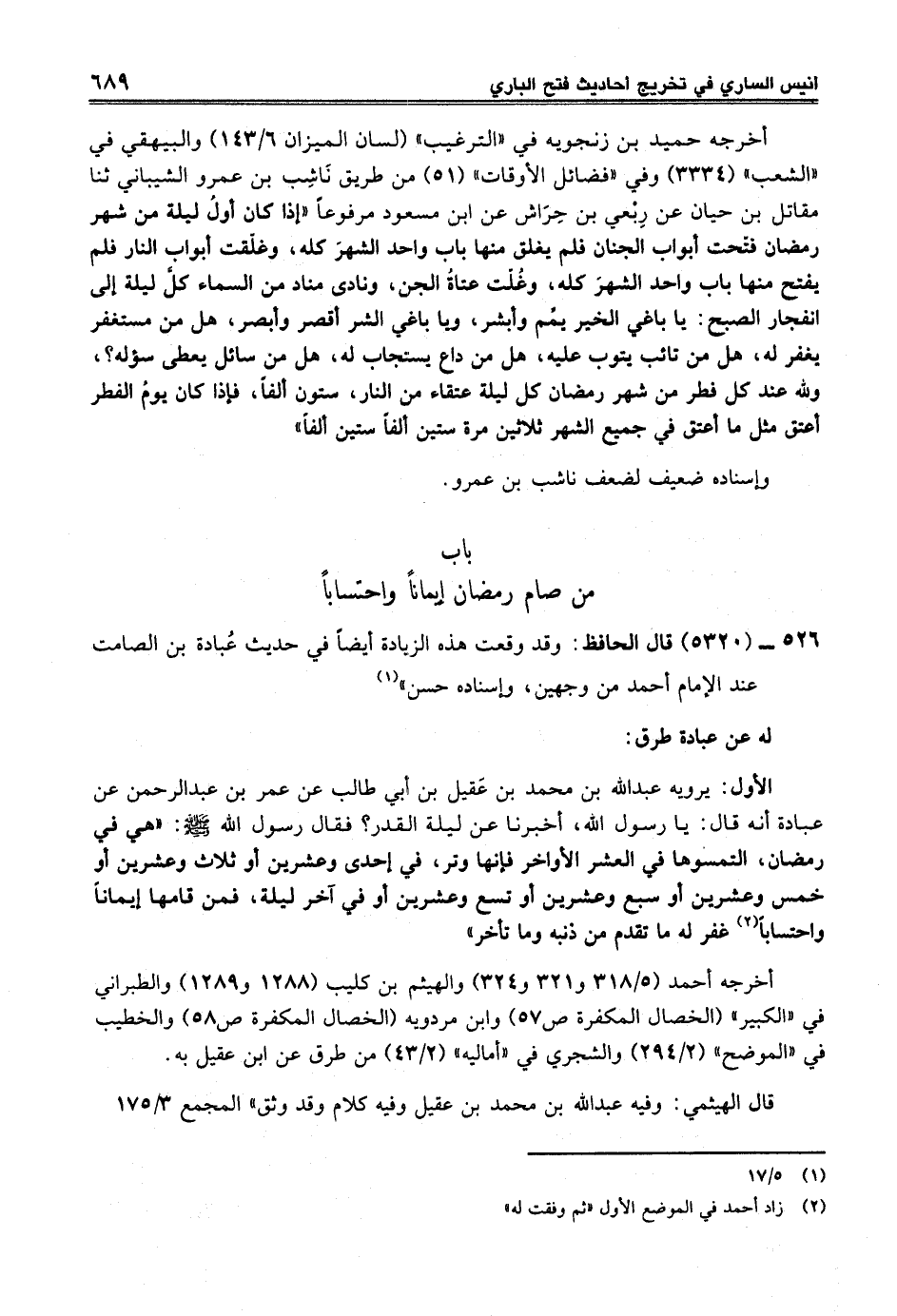 526 - (5320) قال الحافظ: وقد وقعت هذه الزيادة أيضاً في حديث عُبادة بن الصامت عند الإِمام أحمد من وجهين، وإسناده حسن" (¬1)