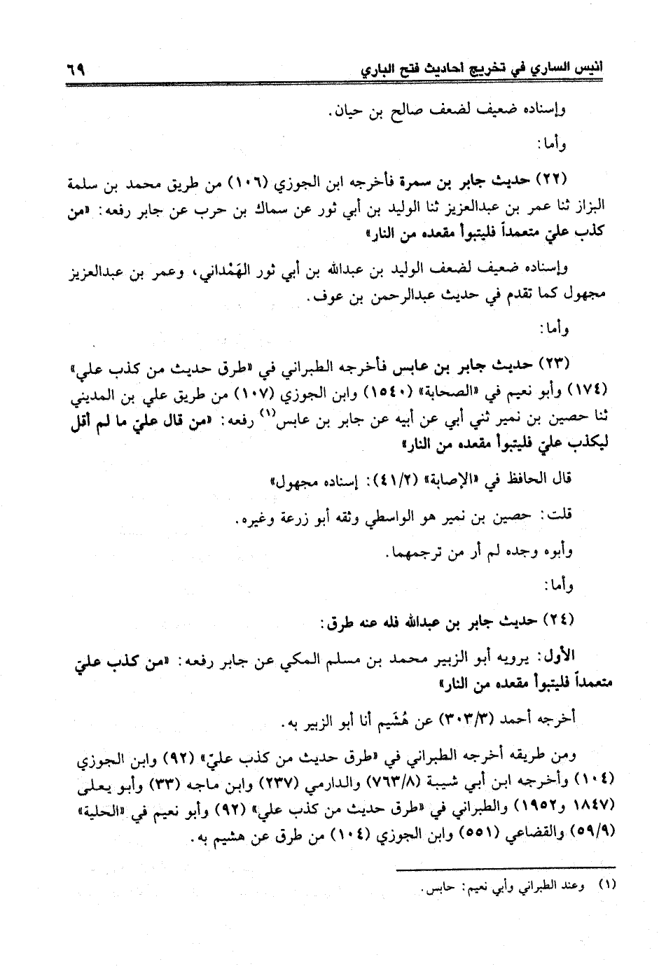 (23) حديث جابر بن عابس فأخرجه الطبراني في "طرق حديث من كذب علي" (174) وأبو نعيم في "الصحابة" (1540) وابن الجوزى (107) من طريق علي بن المديني ثنا حصين بن نمير ثني أبي عن أبيه عن جابر بن عابس (¬1) رفعه: "من قال عليّ ما لم أقل ليكذب عليّ فليتبوأ مقعده في النار"