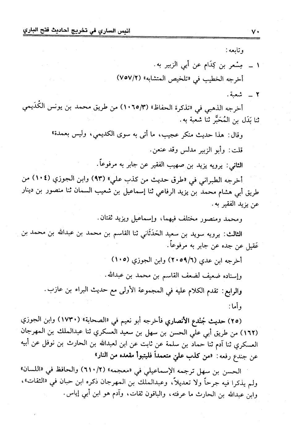 (25) حديث جُنْدع الأنصاري فأخرجه أبو نعيم في "الصحابة" (1730) وابن الجوزي (162) من طريق أبي علي الحسن بن سهل بن سعيد العسكري ثنا عبد الملك بن المهرجان العسكري ثنا آدم ثنا حماد بن سلمة عن ثابت عن ابن لعبد الله بن الحارث بن نوفل عن أبيه عن جندع رفعه: "من كذب عليّ متعمداً فليتبوأ مقعده من النار"