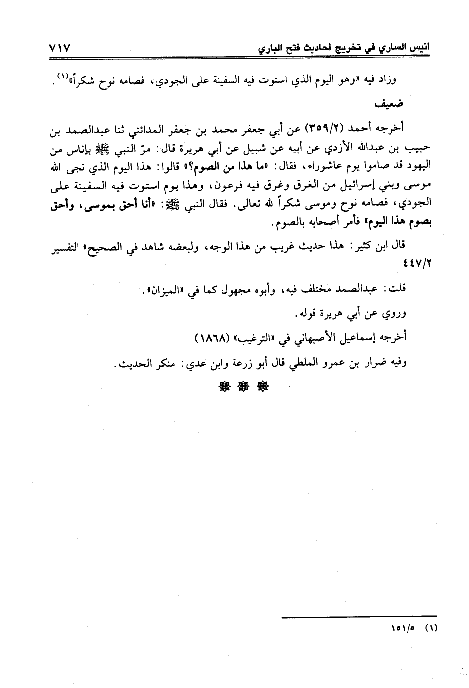 أخرجه أحمد (2/ 359) عن أبي جعفر محمد بن جعفر المدائني ثنا عبد الصمد بن حبيب بن عبد الله الأزدي عن أبيه عن شيل عن أبي هريرة قال: مرّ النبي -صلى الله عليه وسلم- بإناس من اليهود قد صاموا يوم عاشوراء، فقال: "ما هذا من الصوم؟ " قالوا: هذا اليوم الذي نجى الله موسى وبني إسرائيل من الغرق وغرق فيه فرعون، وهذا يوم استوت فيه السفينة على الجودي، فصامه نوح وموسى شكراً لله تعالى، فقال النبي -صلى الله عليه وسلم-: "أنا أحق بموسى، وأحق بصوم هذا اليوم" فأمر أصحابه بالصوم.