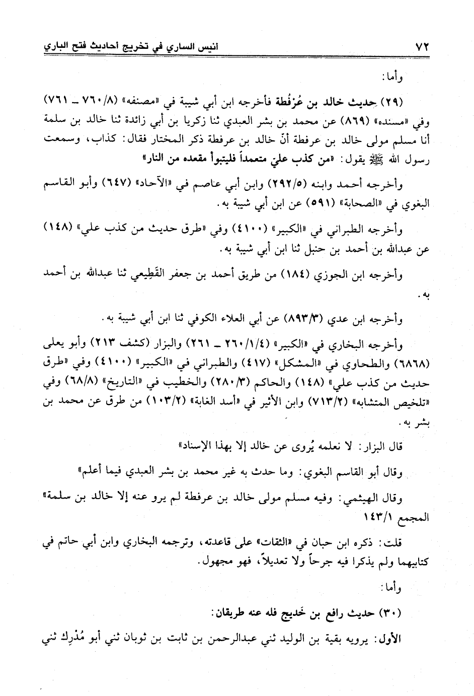 (29) حديث خالد بن عُرْفُطة فأخرجه ابن أبي شيبة في "مصنفه" (8/ 760 - 761) وفي "مسنده" (869) عن محمد بن بشر العبدي ثنا زكريا بن أبي زائدة ثنا خالد بن سلمة أنا مسلم مولى خالد بن عرفطة أنّ خالد بن عرفطة ذكر المختار فقال: كذاب، وسمعت رسول الله -صلى الله عليه وسلم- يقول: "من كذب عليّ متعمداً فليتبوأ مقعده من النار"