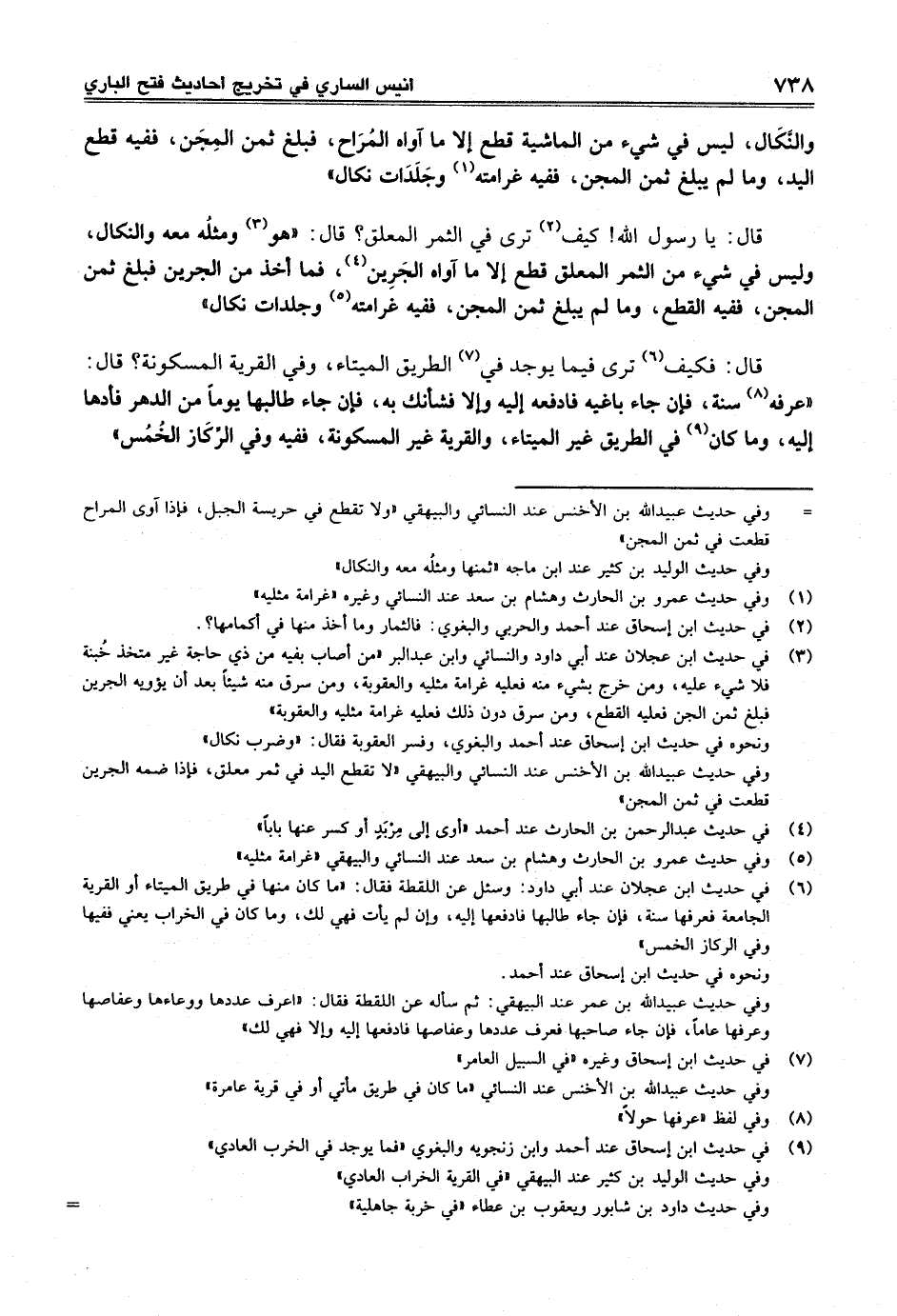 (¬3) في حديث ابن عجلان عند أبي داود والنسائي وابن عبد البر "من أصاب بفيه من ذي حاجة غير متخذ خُبنة فلا شيء عليه، ومن خرج بشيء منه فعليه غرامة مثليه والعقوبة، ومن سرق منه شيئاً بعد أن يؤويه الجرين فبلغ ثمن الجن فعليه القطع، ومن سرق دون ذلك فعليه غرامة مثليه والعقوبة"