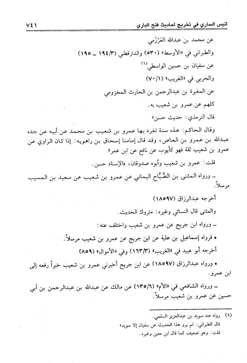 وقال الحاكم: هذه سنة تفرد بها عمرو بن شعيب بن محمد عن أبيه عن جده عبد الله بن عمرو بن العاص، وقد قال إمامنا إسحاق بن راهويه: إذا كان الراوي عن عمرو بن شعيب ثقة فهو كأيوب عن نافع عن ابن عمر"