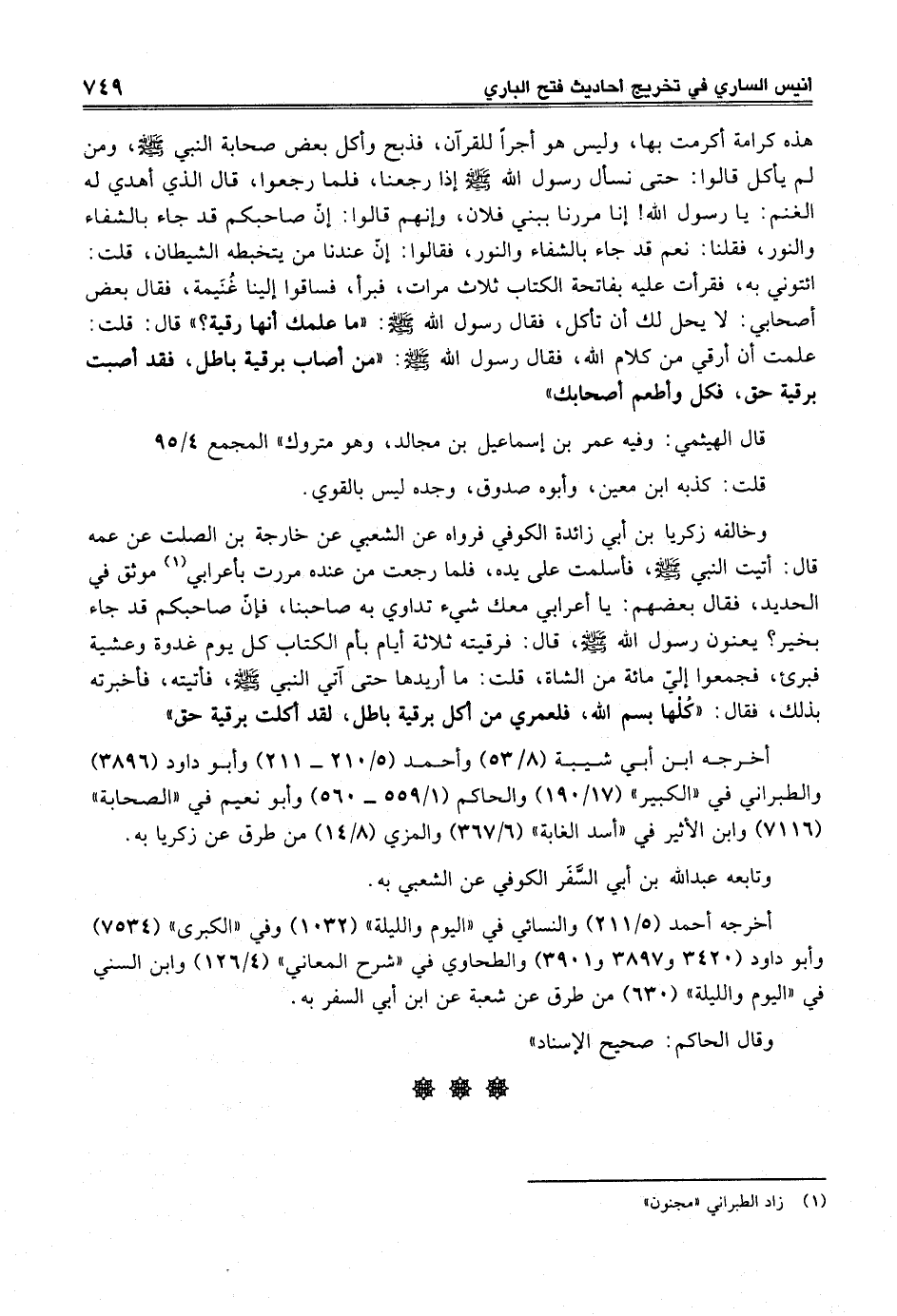 وخالفه زكريا بن أبي زائدة الكوفي فرواه عن الشعبي عن خارجة بن الصلت عن عمه قال: أتيت النبي -صلى الله عليه وسلم-، فأسلمت على يده، فلما رجعت من عنده مررت بأعرابي (¬1) موثق في الحديد، فقال بعضهم: يا أعرابي معك شيء تداوي به صاحبنا، فإنّ صاحبكم قد جاء بخير؟ يعنون رسول الله -صلى الله عليه وسلم-، قال: فرقيته ثلاثة أيام بأم الكتاب كل يوم غدوة وعشية فبرىء، فجمعوا إلي مائة من الشاة، قلت: ما أريدها حتى آتي النبي -صلى الله عليه وسلم-، فأتيته، فأخبرته بذلك، فقال: "كُلْها بسم الله، فلعمري من أكل برقية باطل، لقد أكلت برقية حق"