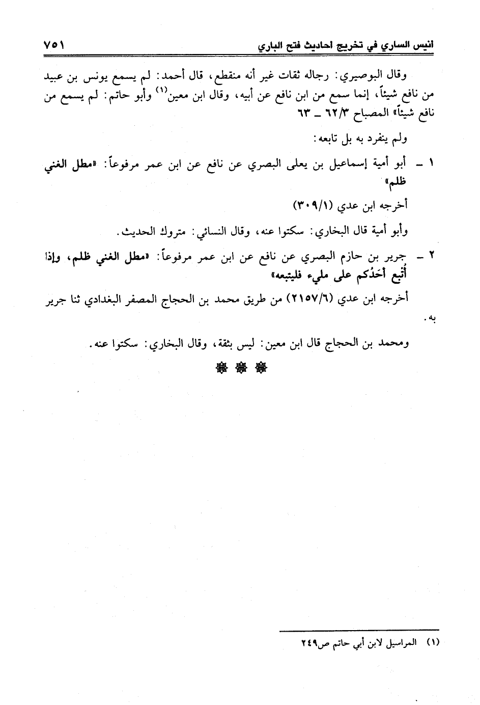2 - جرير بن حازم البصري عن نافع عن ابن عمر مرفوعاً: "مطل الغني ظلم، وإذا أُتْبع أحَدُكم على مليء فليتبعه"