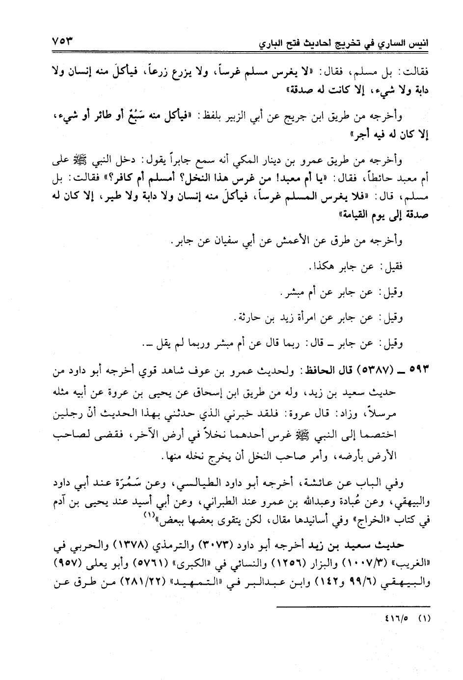 وأخرجه من طريق عمرو بن دينار المكي أنه سمع جابراً يقول: دخل النبي -صلى الله عليه وسلم- على أم معبد حائطاً، فقال: "يا أم معبد! من غرس هذا النخل؟ أمسلم أم كافر؟ " فقالت: بل مسلم، قال: "فلا يغرس المسلم غرساً، فيأكلَ منه إنسان ولا دابة ولا طير، إلا كان له صدقة إلى يوم القيامة"