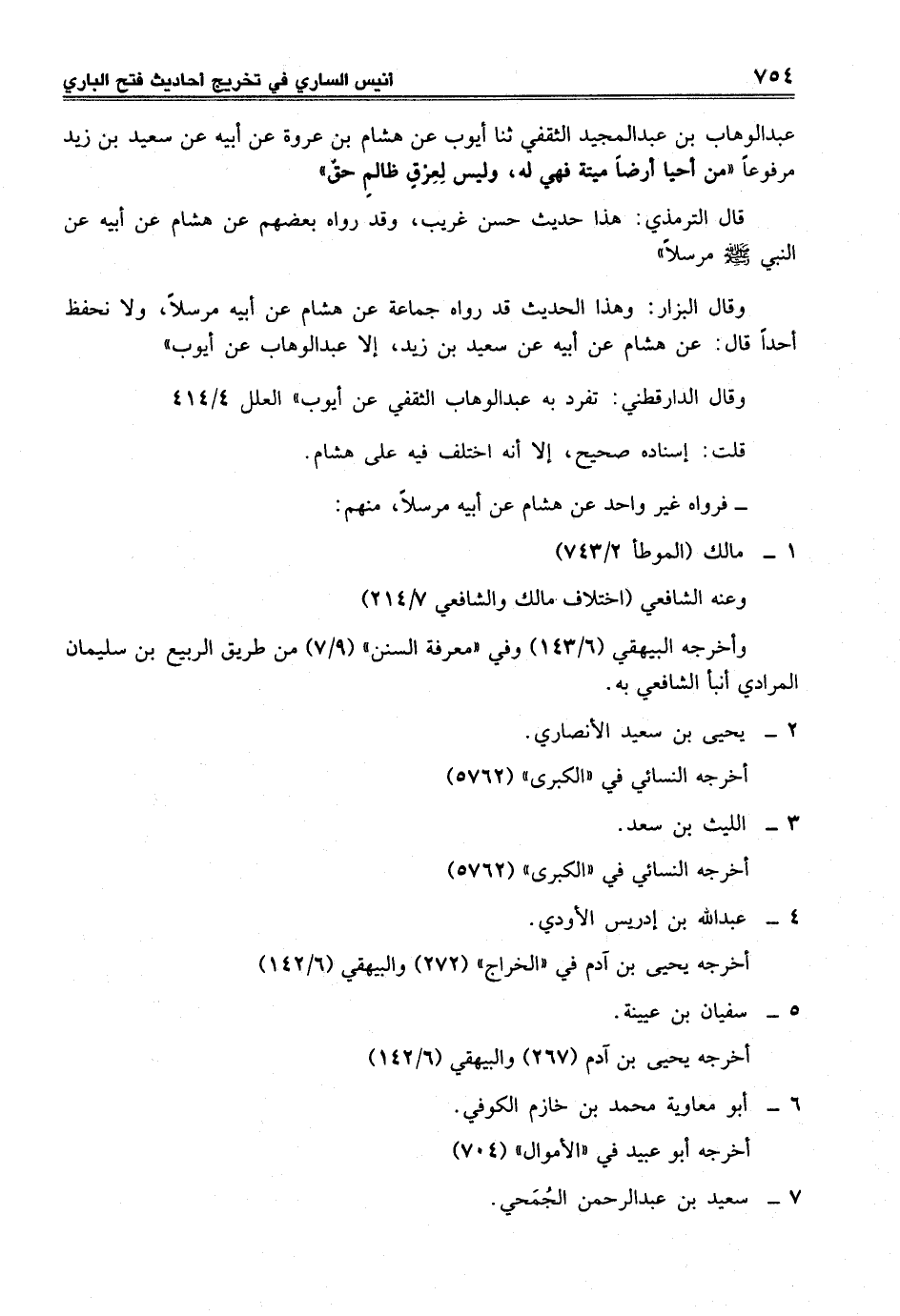 عبد الوهاب بن عبد المجيد الثقفي ثنا أيوب عن هشام بن عروة عن أبيه عن سعيد بن زيد مرفوعاً "من أحيا أرضاً ميتة فهي له، وليس لِعِرْقٍ ظالمٍ حقٌ"