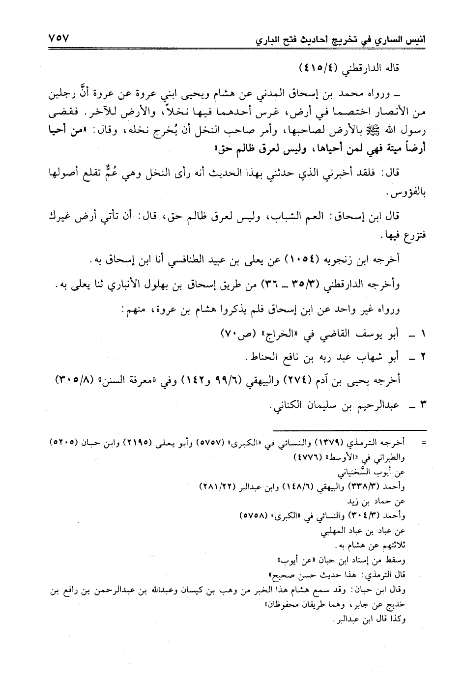 - ورواه محمد بن إسحاق المدني عن هشام ويحيى ابني عروة عن عروة أنَّ رجلين من الأنصار اختصما في أرض، غرس أحدهما فيها نخلاً، والأرض للآخر. فقضى رسول الله -صلى الله عليه وسلم- بالأرض لصاحبها، وأمر صاحب النخل أن يُخرج نخله، وقال: "من أحيا أرضاً ميتة فهي لمن أحياها, وليس لعرق ظالم حق"