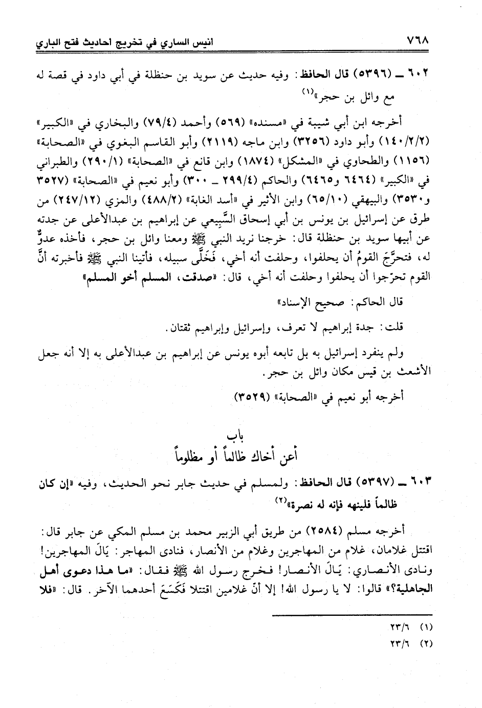 602 - (5396) قال الحافظ: وفيه حديث عن سويد بن حنظلة في أبي داود في قصة له مع وائل بن حجر" (¬1)