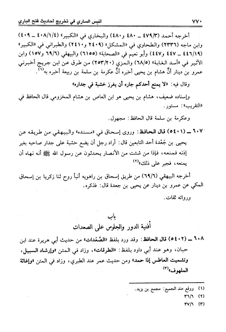 607 - (5401) قال الحافظ: وروى إسحاق في "مسنده" والبيهقي من طريقه عن يحيى بن جَعْدة أحد التابعين قال: أراد رجل أن يضع خشبة على جدار صاحبه بغير إذنه فمنعه، فإذا من شئت من الأنصار يحدثون عن رسول الله -صلى الله عليه وسلم- أنه نهاه أن يمنعه، فجبر على ذلك" (¬2)