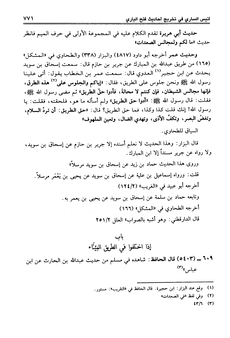 وحديث عمر أخرجه أبو داود (4817) والبزار (338) والطحاوي في "المشكل" (165) من طريق عبد الله بن المبارك عن جرير بن حازم قال: سمعت إسحاق بن سويد يحدث عن ابن حجير (¬1) العدوي قال: سمعت عمر بن الخطاب يقول: أتى علينا رسول الله -صلى الله عليه وسلم- ونحن جلوس على الطريق، فقال: "إياكم والجلوس على (¬2) هذه الطرق، فإنها مجالس الشيطان، فإن كنتم لا محالةَ، فأدوا حقَّ الطريق" ثم مضى رسول الله -صلى الله عليه وسلم-، فقلت: قال رسول الله -صلى الله عليه وسلم-: "أدوا حق الطريق" ولم أسأله ما هو، فلحقته، فقلت: يا رسول الله! إنك قلت كذا وكذا، فما حق الطريق؟ قال: "حق الطريق: أن تردَّ السلام، وتغضَّ البصر، وتكف الأذى، وتهدي الضال، وتعين الملهوف"
