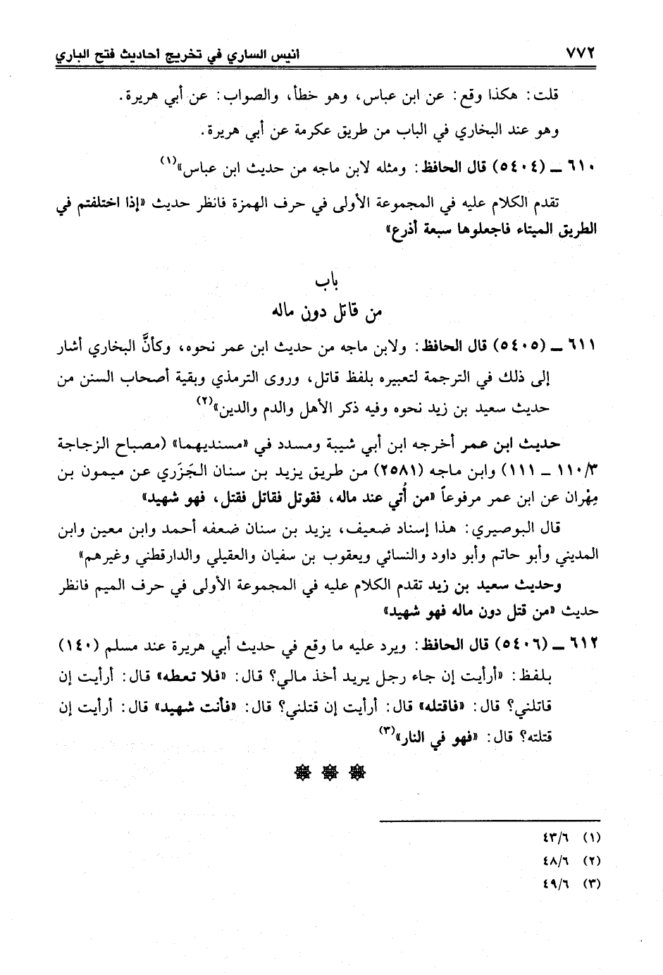 611 - (5405) قال الحافظ: ولابن ماجه من حديث ابن عمر نحوه، وكأنَّ البخاري أشار إلى ذلك في الترجمة لتعبيره بلفظ قاتل، وروى الترمذي وبقية أصحاب السنن من حديث سعيد بن زيد نحوه وفيه ذكر الأهل والدم والدين" (¬2)