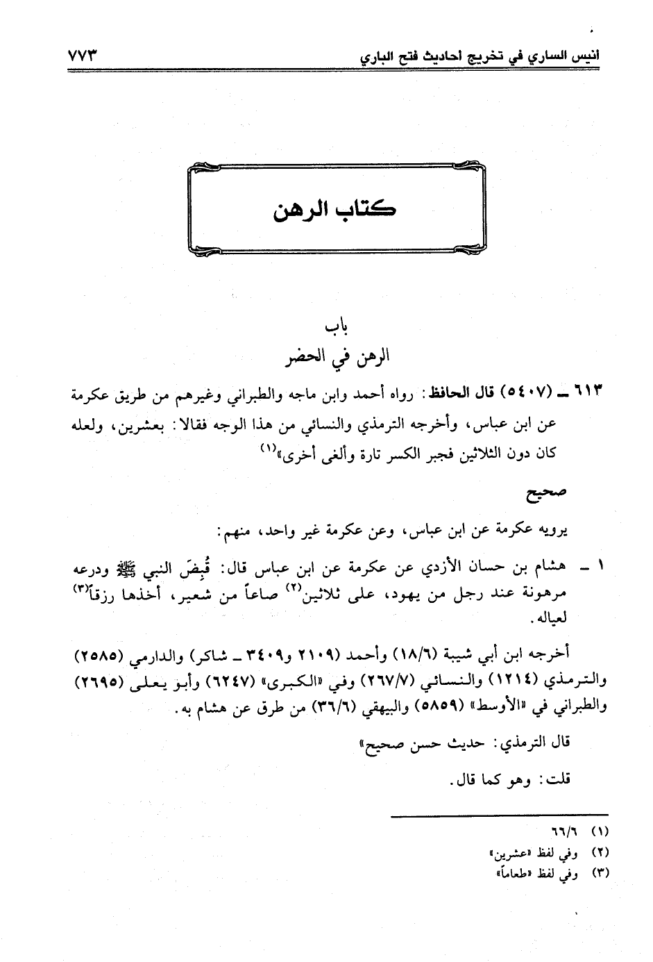 1 - هشام بن حسان الأزدي عن عكرمة عن ابن عباس قال: قُبِضَ النبي -صلى الله عليه وسلم- ودرعه مرهونة عند رجل من يهود، على ثلاثين (¬2) صاعاً من شعير، أخذها رزقاً (¬3) لعياله.
