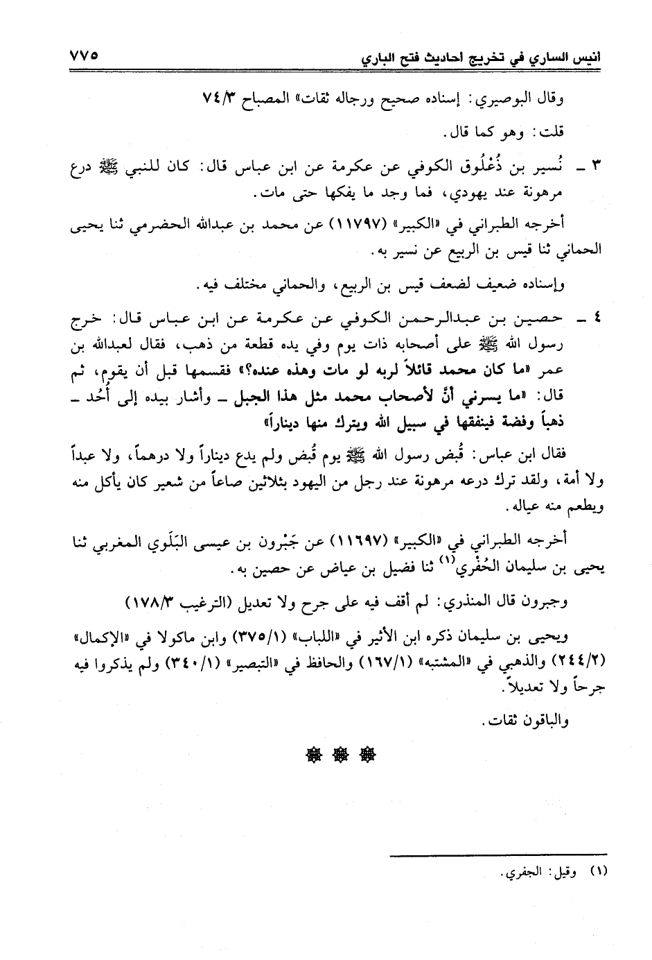 3 - نُسير بن ذُعْلُوق الكوفي عن عكرمة عن ابن عباس قال: كان للنبي -صلى الله عليه وسلم- درع مرهونة عند يهودي، فما وجد ما يفكها حتى مات.