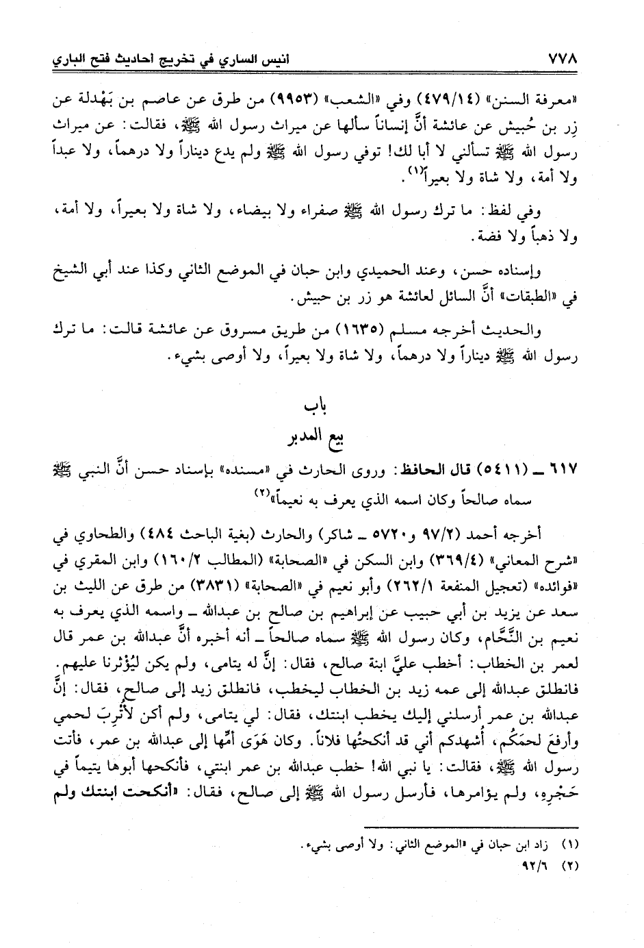 617 - (5411) قال الحافظ: وروى الحارث في "مسنده" بإسناد حسن أنَّ النبي -صلى الله عليه وسلم- سماه صالحاً وكان اسمه الذي يعرف به نعيماً" (¬2)