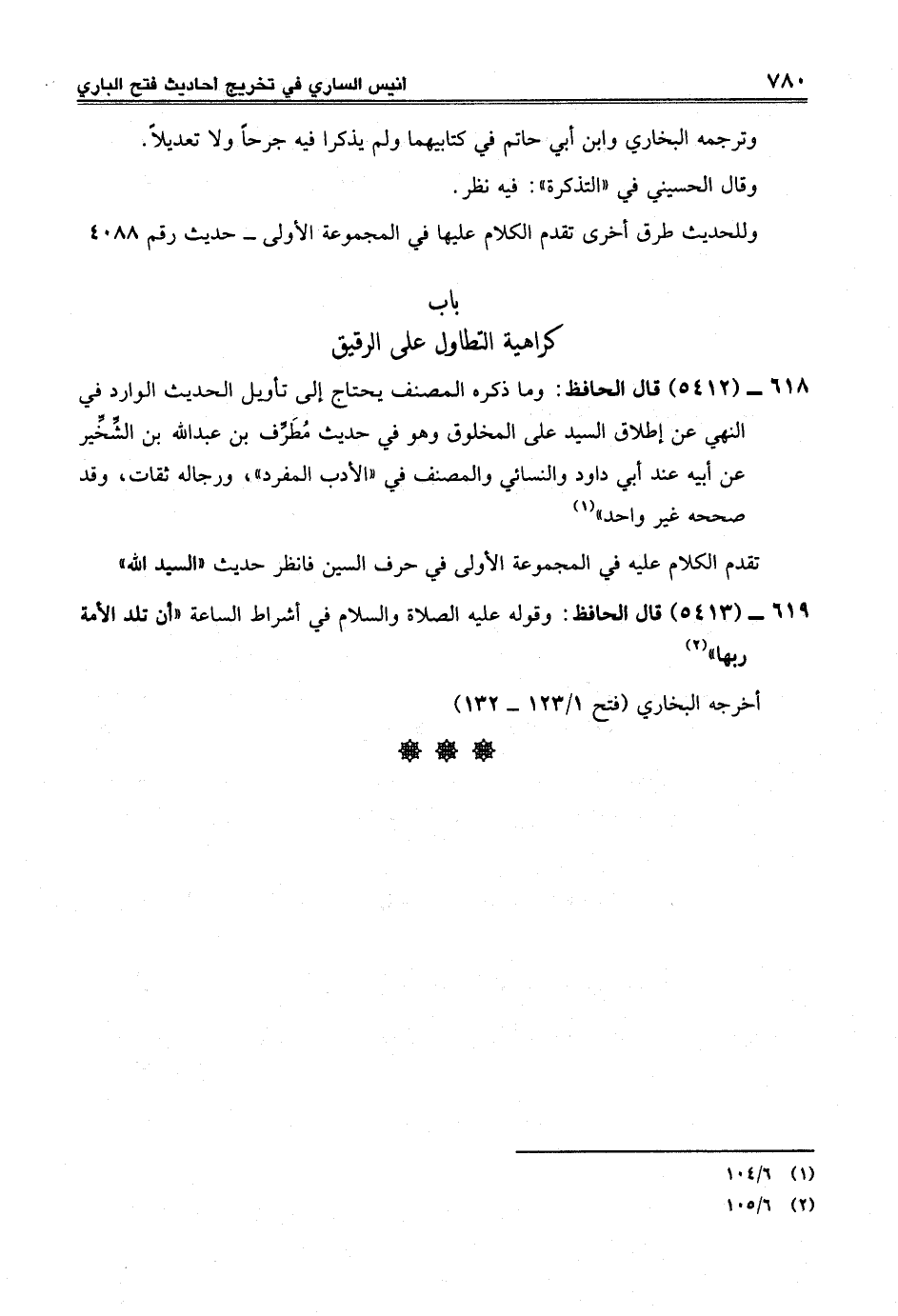618 - (5412) قال الحافظ: وما ذكره المصنف يحتاج إلى تأويل الحديث الوارد في النهي عن إطلاق السيد على المخلوق وهو في حديث مُطَرِّف بن عبد الله بن الشِّخِّير عن أبيه عند أبي داود والنسائي والمصنف في "الأدب المفرد"، ورجاله ثقات، وقد صححه غير واحد" (¬1)