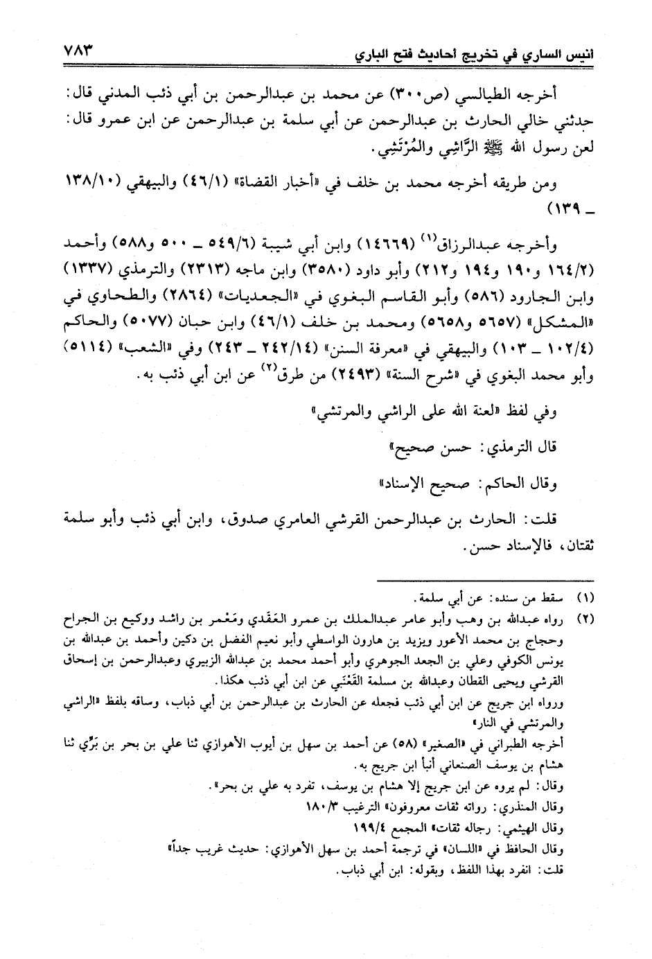 أخرجه الطيالسي (ص 300) عن محمد بن عبد الرحمن بن أبي ذئب المدني قال: حدثني خالي الحارث بن عبد الرحمن عن أبي سلمة بن عبد الرحمن عن ابن عمرو قال: لعن رسول الله -صلى الله عليه وسلم- الرَّاشِي والمُرْتَشِي.