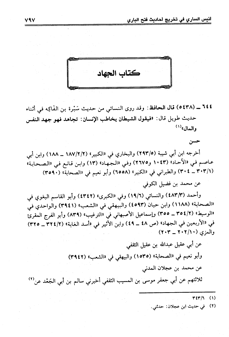 644 - (5438) قال الحافظ: وقد روى النسائي من حديث سَبْرة بن الفَاكِه في أثناء حديث طويل قال: "فيقول الشيطان يخاطب الإنسان: تجاهد فهو جهد النفس والمال" (¬1)