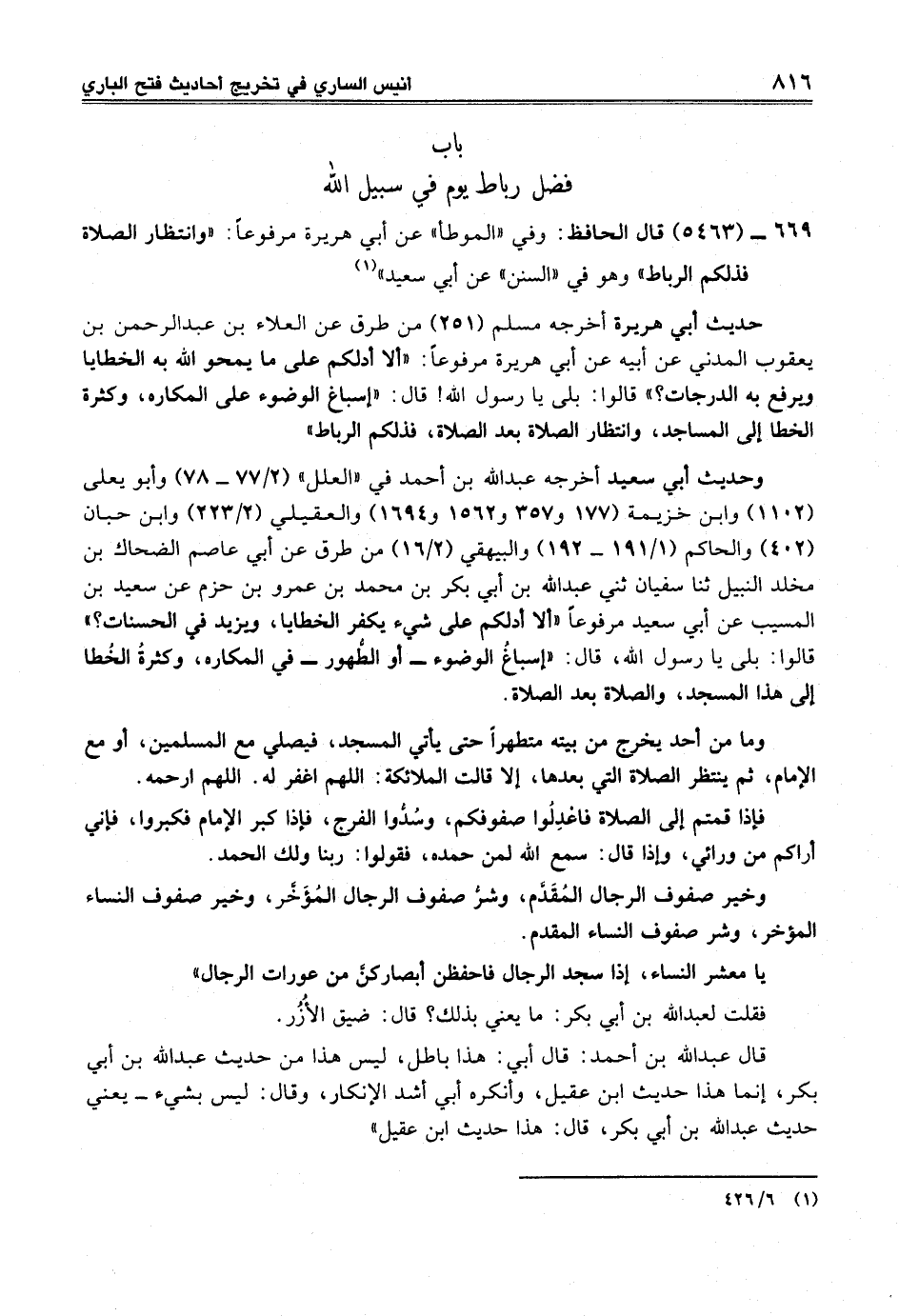 669 - (5463) قال الحافظ: وفي "الموطأ" عن أبي هريرة مرفوعاً: "وانتظار الصلاة فذلكم الرباط" وهو في "السنن" عن أبي سعيد" (¬1)
