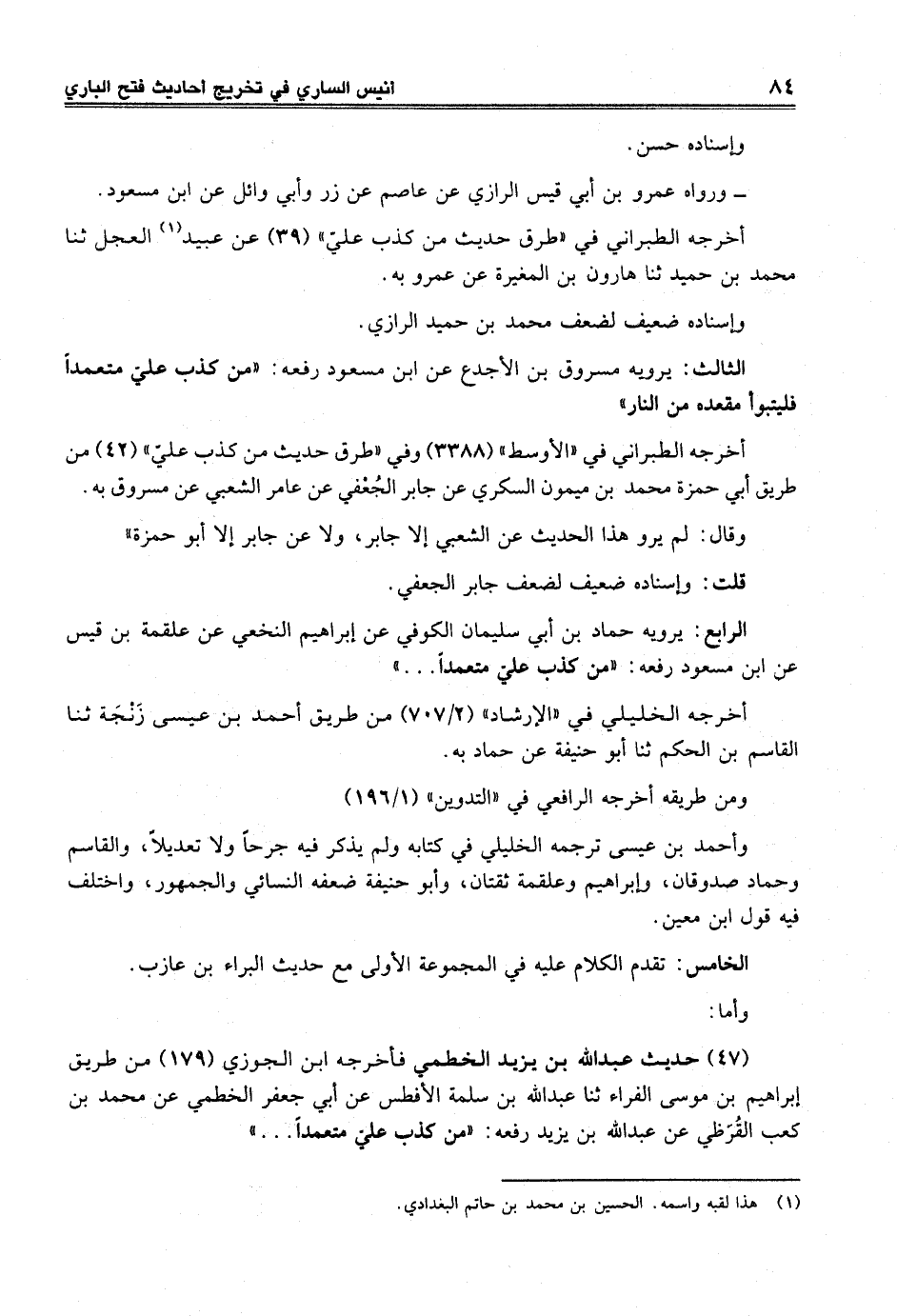 الرابع: يرويه حماد بن أبي سليمان الكوفي عن إبراهيم النخعي عن علقمة بن قيس عن ابن مسعود رفعه: "من كذب عليّ متعمداً ... "