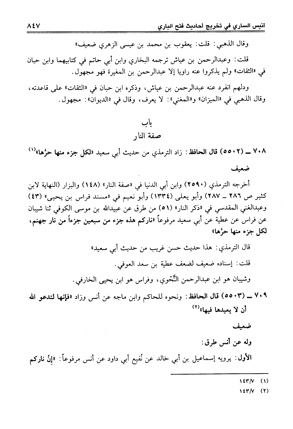 أخرجه الترمذي (2590) وابن أبي الدنيا في "صفة النار" (148) والبزار (النهاية لابن كثير ص 286 - 287) وأبو يعلى (1334) وأبو نعيم في "مسند فراس بن يحيى" (43) وعبد الغني المقدسي في "ذكر النار" (51) من طرق عن عبيد الله بن موسى الكوفي ثنا شيبان عن فراس عن عطية عن أبي سعيد مرفوعاً "ناركم هذه جزء من سبعين جزءاً من نار جهنم، لكل جزء منها حرُّها"