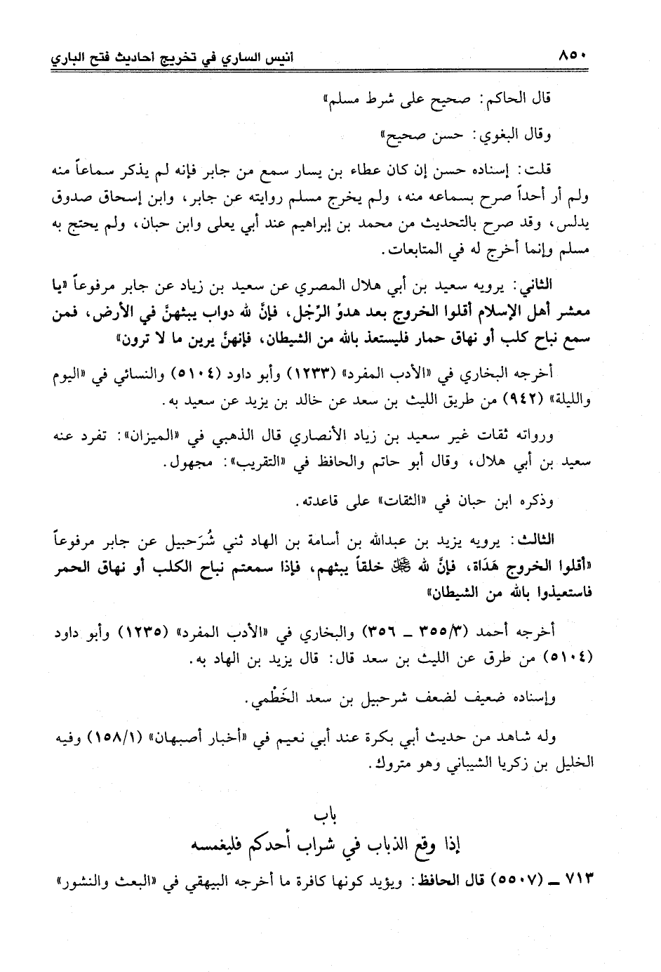 الثالث: يرويه يزيد بن عبد الله بن أسامة بن الهاد ثني شُرَحبيل عن جابر مرفوعاً "أقلوا الخروج هَدَاة، فإنَّ لله عز وجل خلقاً يبثهم، فإذا سمعتم نباح الكلب أو نهاق الحمر فاستعيذوا بالله من الشيطان"