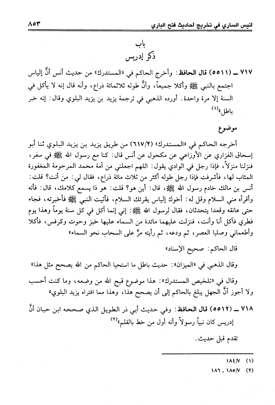 717 - (5511) قال الحافظ: وأخرج الحاكم في "المستدرك" من حديث أنس أنَّ إلياس اجتمع بالنبي -صلى الله عليه وسلم- وأكلا جميعاً، وأنَّ طوله ثلاثمائة ذراع، وأنه قال إنه لا يأكل في السنة إلا مرة واحدة. أورده الذهبي في ترجمة يزيد بن يزيد البلوي وقال: إنه خبر باطل" (¬1)