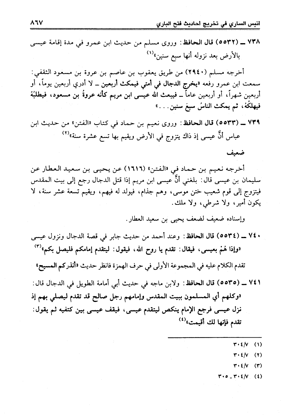 739 - (5533) قال الحافظ: وروى نعيم بن حماد في كتاب "الفتن" من حديث ابن عباس أنَّ عيسى إذ ذاك يتزوج في الأرض ويقيم بها تسع عشرة سنة" (¬2)