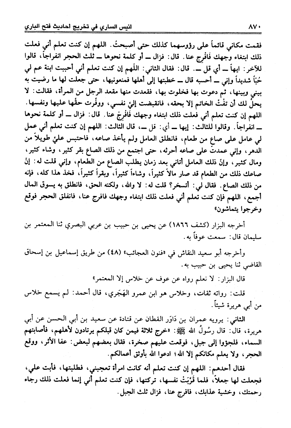 فقمت مكاني قائماً على رؤوسهما كذلك حتى أصبحتُ. اللهم إن كنت تعلم أني فعلت ذلك ابتغاء وجهك فَافْرِج عنا. قال: فزال -أو كلمة نحوها- ثلث الحجر انفراجاً، قالوا للآخرة ايهاً -أي قل-. قال: فقال الثاني: اللهم إن كنت تعلم أني أحببت ابنة عم لي حُبّاً شديداً وإني -أحسبه قال- خطبتها إلى أهلها فمنعونيها، حتى جعلت لها ما رضيت به بيني وبينها، ثم دعوت بها فخلوت بها، فقعدت منها مقعد الرجل من المرأة، فقالت: لا يحلُّ لك أن تفُتَّ الخاتم إلا بحقه، فانقبضت إليَّ نفسي، ووفرت حقَّها عليها ونفسها. اللهم إن كنت تعلم أني فعلت ذلك ابتغاء وجهك فَافْرِجْ عنا. قال: فزال -أو كلمة نحوها- انفراجاً. وقالوا للثالث: إيها -أي: قل-، قال الثالث: اللهم إن كنت تعلم أني عمل لي عامل على صاعٍ من طعام، فانطلق العامل ولم يأخذ صاعه، فاحتبس عليَّ طويلاً من الدهر، وإني عمدت على صاعه أحرثه، حتى اجتمع من ذلك الصاع بقر كثير، وشاء كثير، ومال كثير، وإنّ ذلك العامل أتاني بعد زمان يطلب الصاع من الطعام، وإني قلت له: إن صاعك ذلك من الطعام قد صار مالاً كثيراً، وشاءاً كثيراً، وبقراً كثيراً، فخذ هذا كله، فإنه من ذلك الصاع. فقال لي: أتسخر؟ قلت له: لا والله، ولكنه الحق، فانطلق به يسوق المال أجمع، اللهم فإن كنت تعلم أني فعلت ذلك ابتغاء وجهك فافرج عنا، فانفلق الحجر فوقع وخرجوا يتماشون"