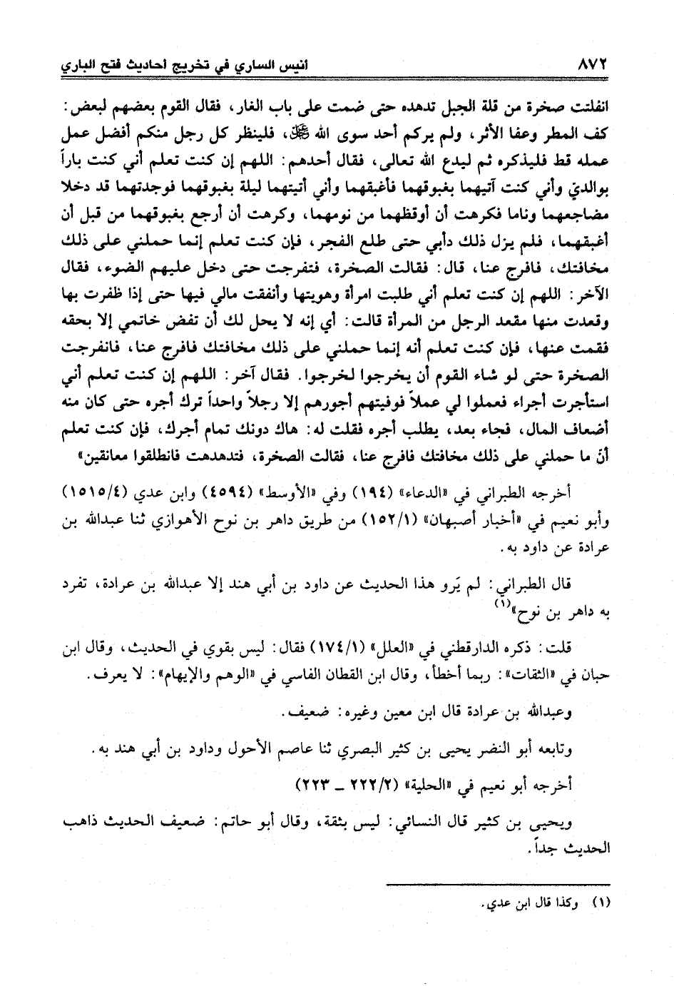 قال الطبراني: لم يَرو هذا الحديث عن داود بن أبي هند إلا عبد الله بن عرادة، تفرد به داهر بن نوح" (¬1)